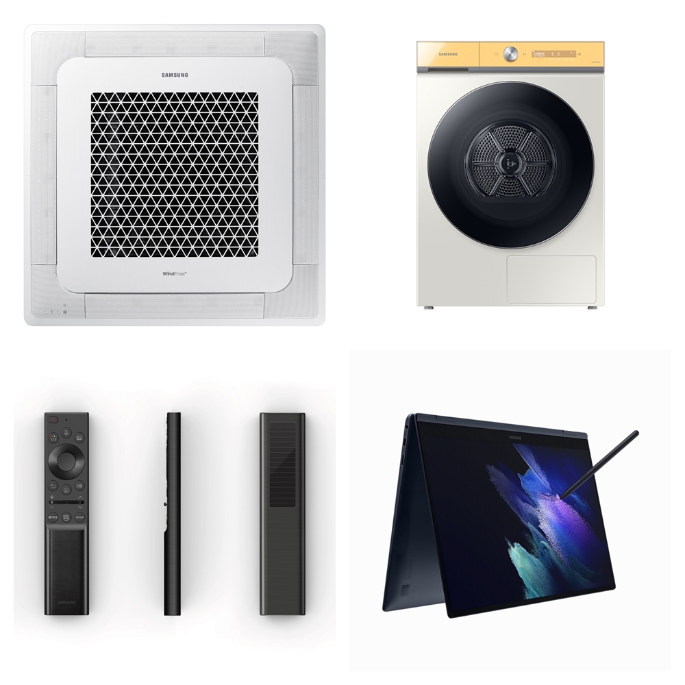 ▲ ‘제24회 올해의 에너지 위너상’에서 수상한 삼성전자 주요 제품들. 사진 윗줄 왼쪽부터 시계 방향으로 ‘삼성 무풍 시스템에어컨 4Way’, ‘비스포크 그랑데 건조기 AI’, ‘갤럭시 북 프로 360’, ‘솔라셀 리모컨’.